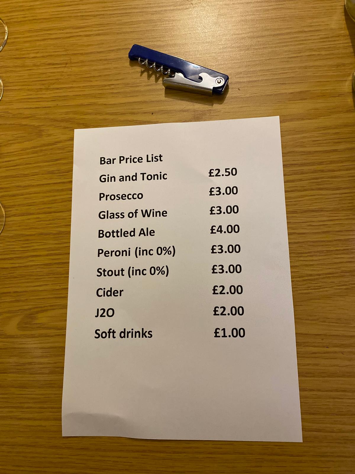 Drinks include a range of beers, wines, spirits and soft drinks.